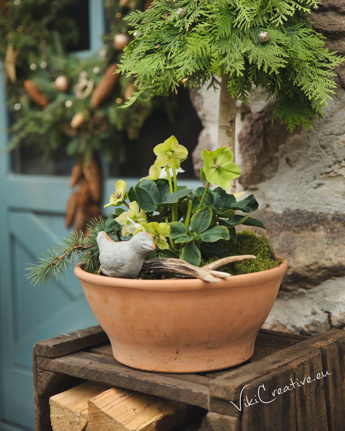 Najskôr som si črepník naplnila hlinou, ktorá poslúžila ako stabilný základ pre celú aranžáciu. Do stredu som zasadila čemericu, ktorá je krásna zimná rastlina a dodá celku jemný, prirodzený akcent.