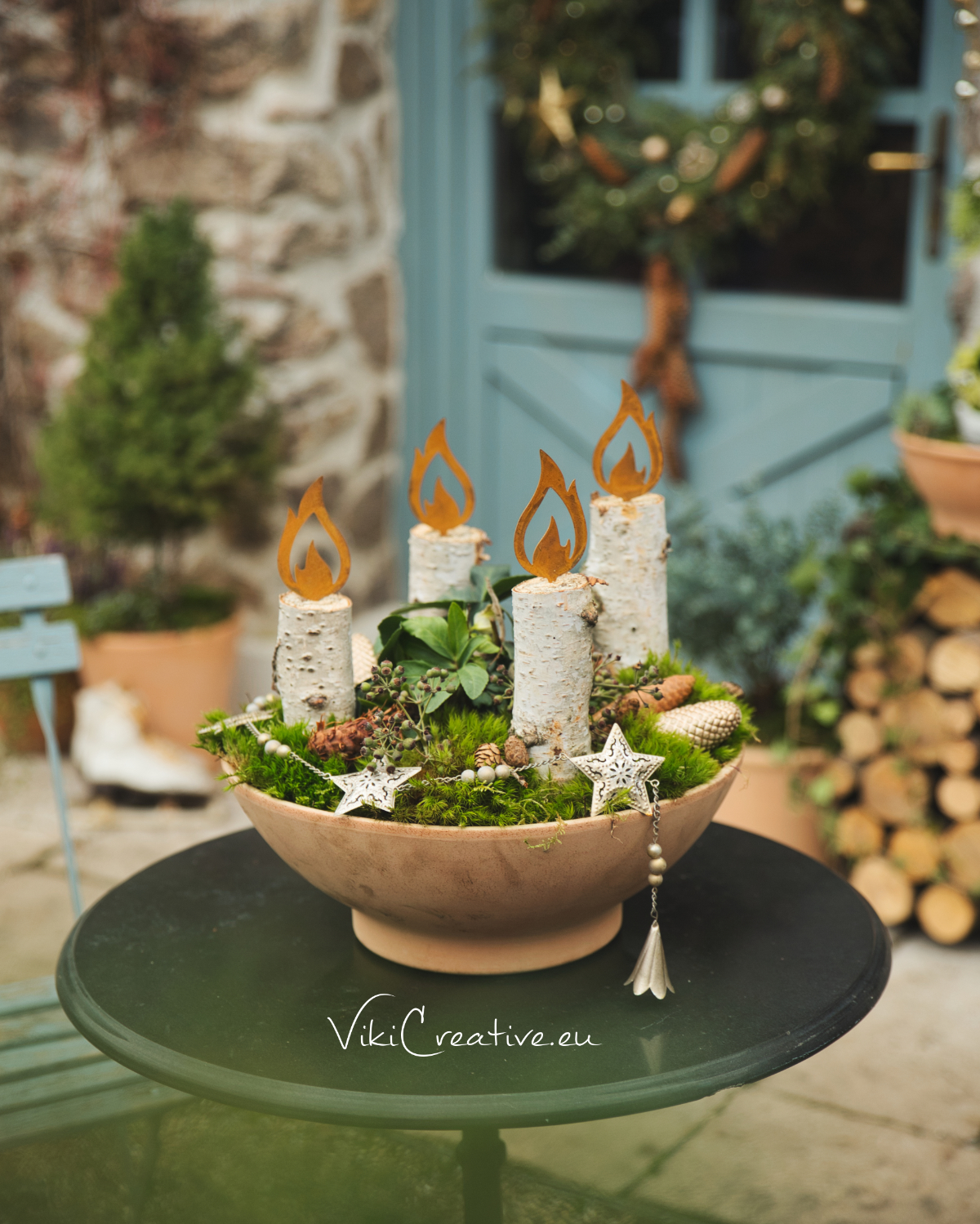 Okolo nej som postupne rozložila kúsky brezovej guľatiny, do ktorých som vložila kovové plamene, čím som vytvorila efekt adventných sviečok. Povrch hliny som následne prekryla machom, ktorý aranžmán krásne zjemnil a prepojil všetky prvky do jedného celku.