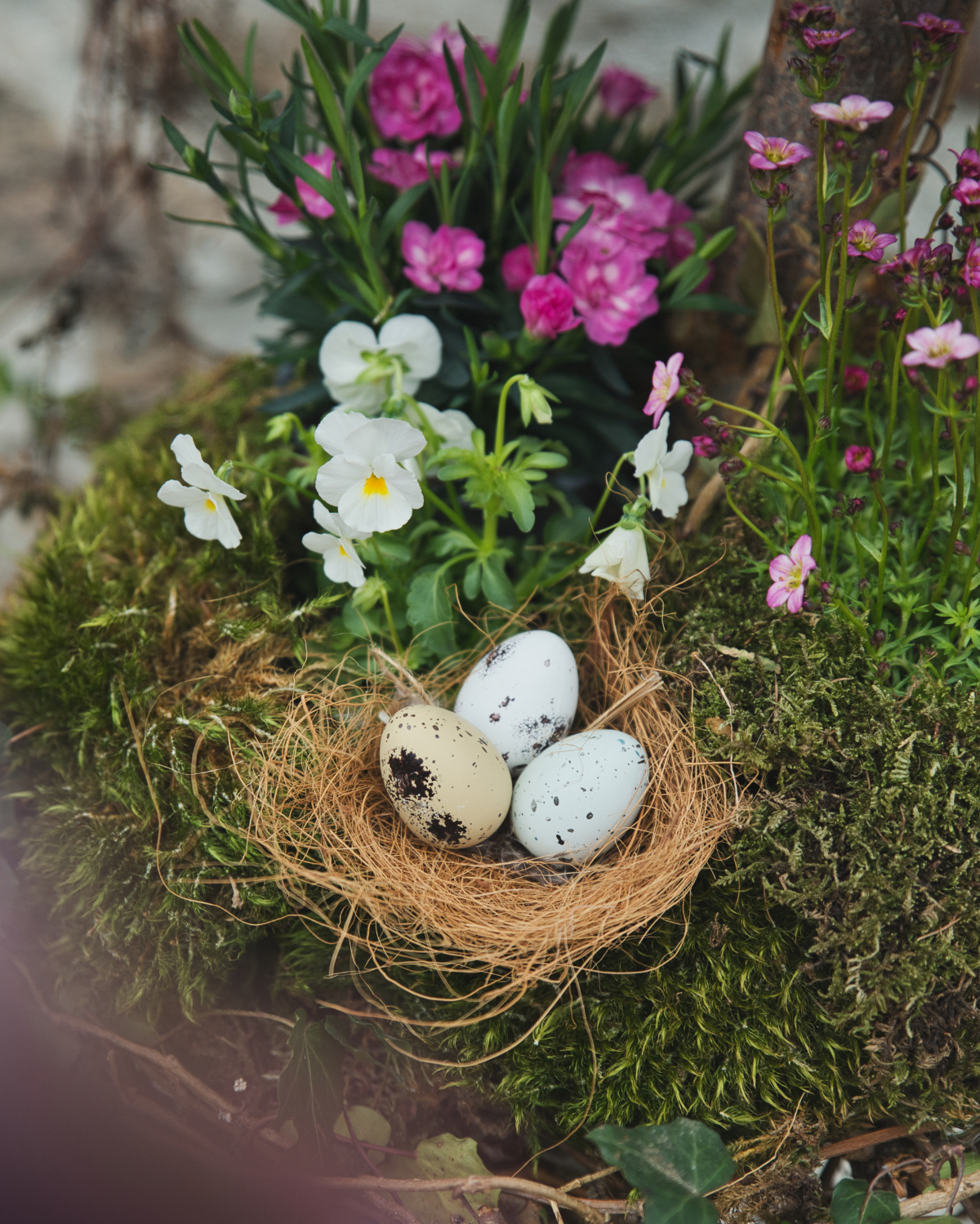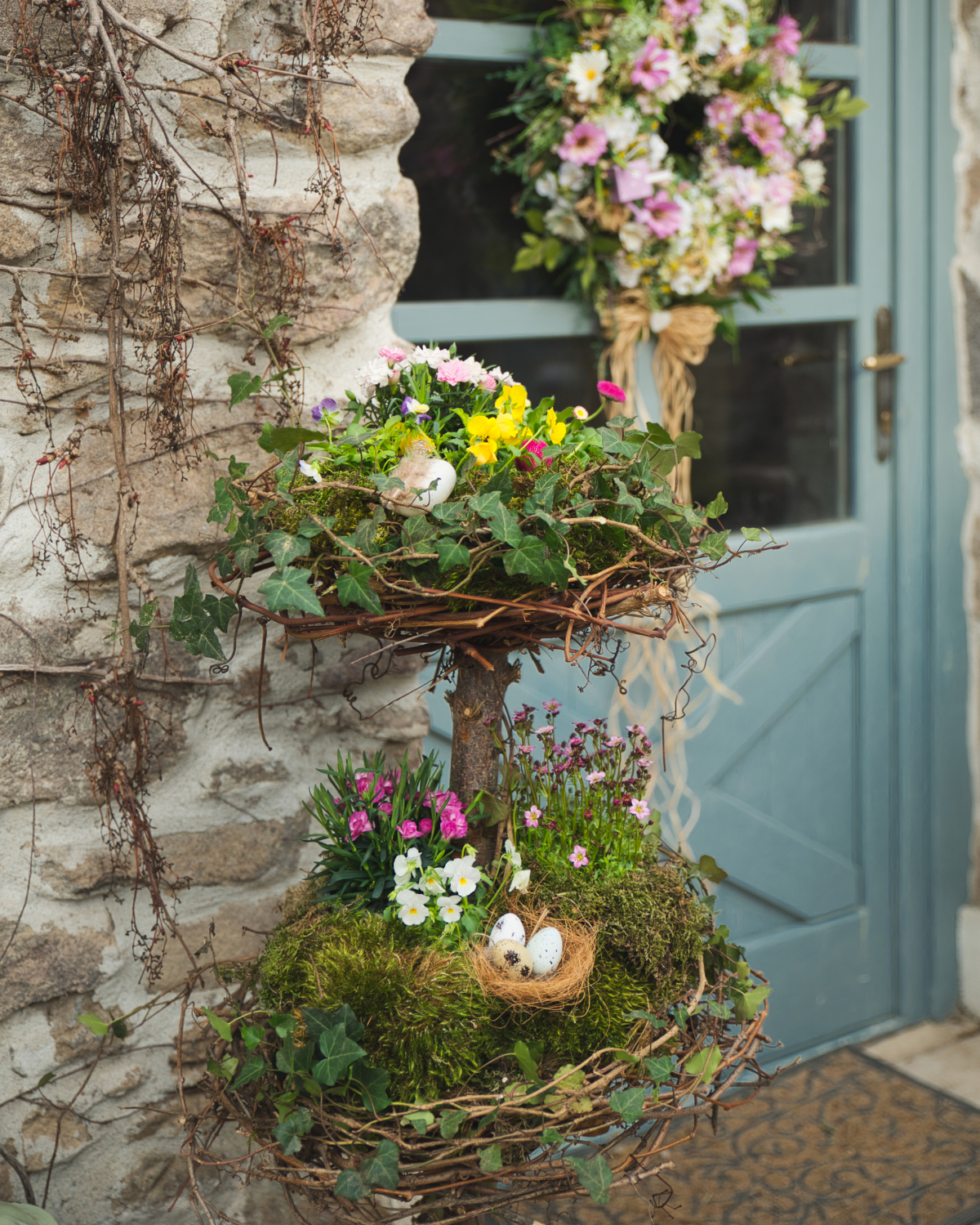 Začiatkom roka som vám ukázala ako si vyrobiť záhradný etažer z rezaného vianočného stromčeka. S príchodom jarných dní prišiel čas, aby konečne zakvitol. Do jednotlivých poschodí som vysadila sirôtky, lomikameň, primulku a hvozdík v rôznych farbách. Pridala som mach, vetvičky brečtanu a vajíčka.